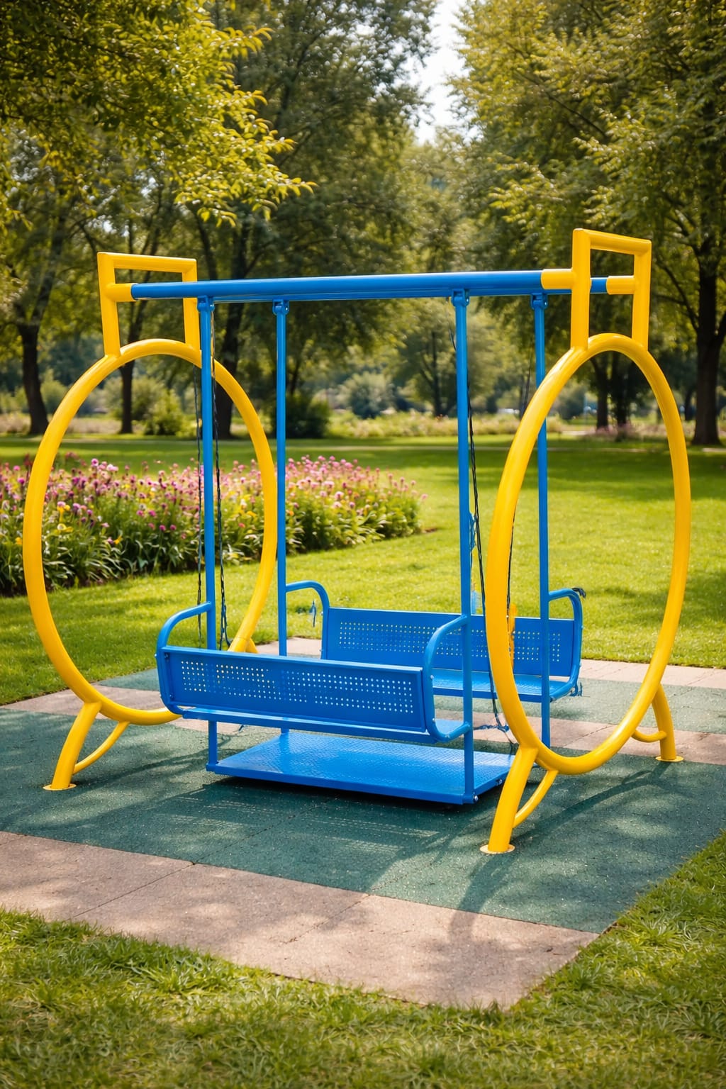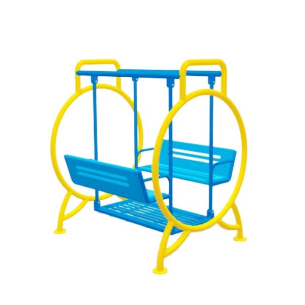 La balançoire est équipée de sièges métalliques perforés assurant confort et sécurité, ainsi que d’un système de suspension solide offrant un mouvement fluide et équilibré. Son design latéral circulaire renforce la stabilité et permet une utilisation collective, y compris pour les enfants à besoins spécifiques, dans une approche de design inclusif (Inclusive Design).