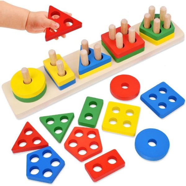 Jeu éducatif Montessori composé de formes géométriques colorées, conçu pour aider les enfants à reconnaître les formes, développer la motricité fine et stimuler la concentration dès le plus jeune âge.