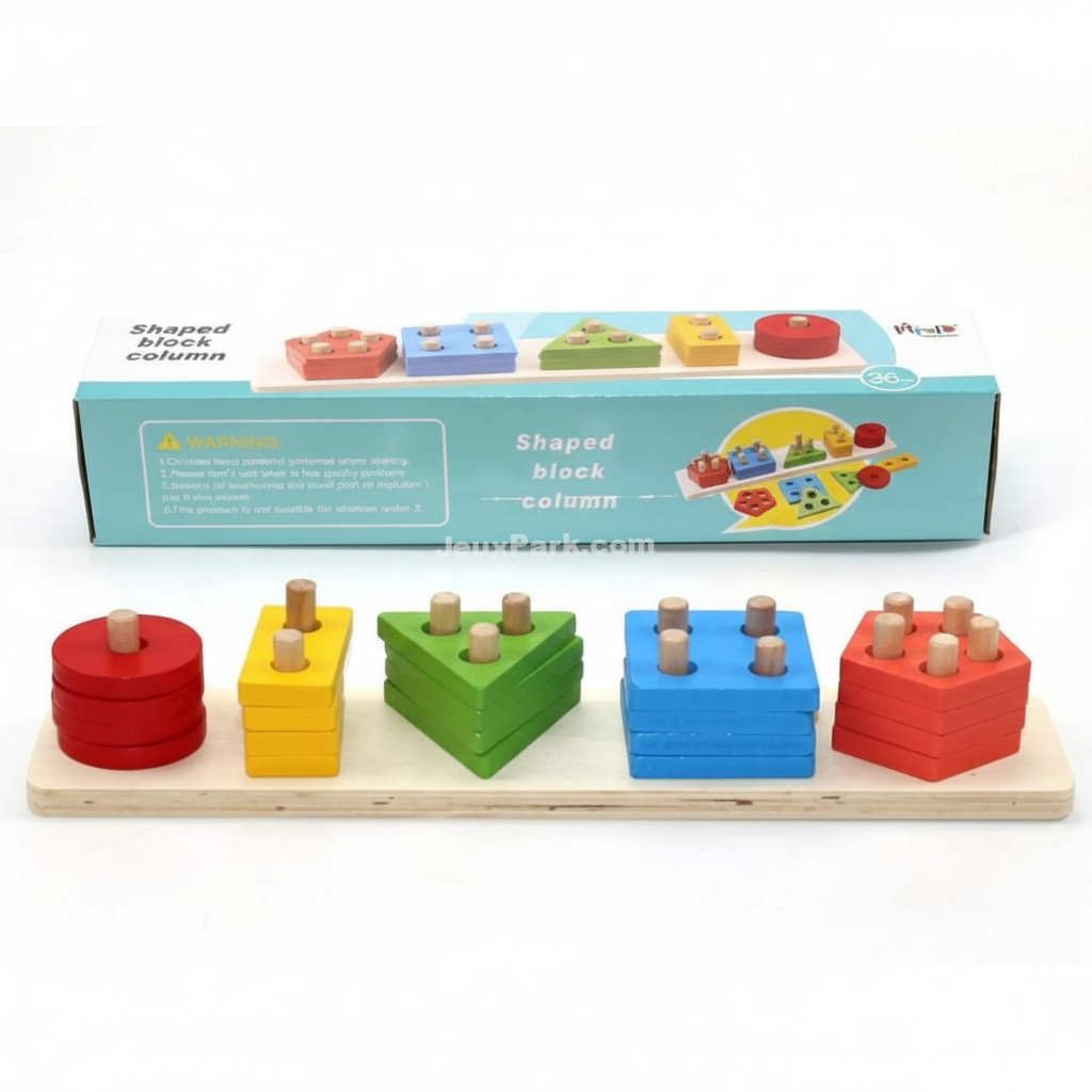 Jeu éducatif Montessori composé de blocs de formes empilables, conçu pour développer la motricité fine, la logique et la reconnaissance des formes et des couleurs chez l’enfant.